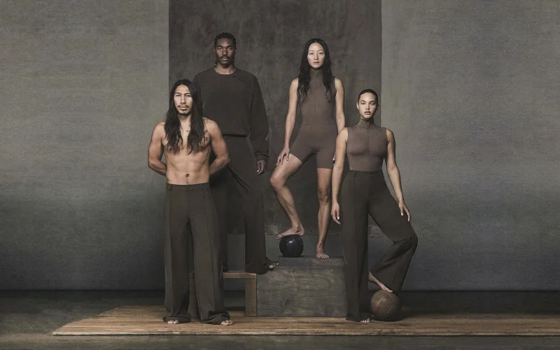 La palette privilegia toni neutri e polverosi, affiancati da un intenso bordeaux che richiama energia e dinamismo. Tra i capi compaiono tute, leggings, reggiseni sportivi, giacche e strati tecnici, insieme alle calzature Lightblaze POD e ACE reinterpretate e a una borsa in pelle nera pensata per il passaggio dalla strada alla palestra.
